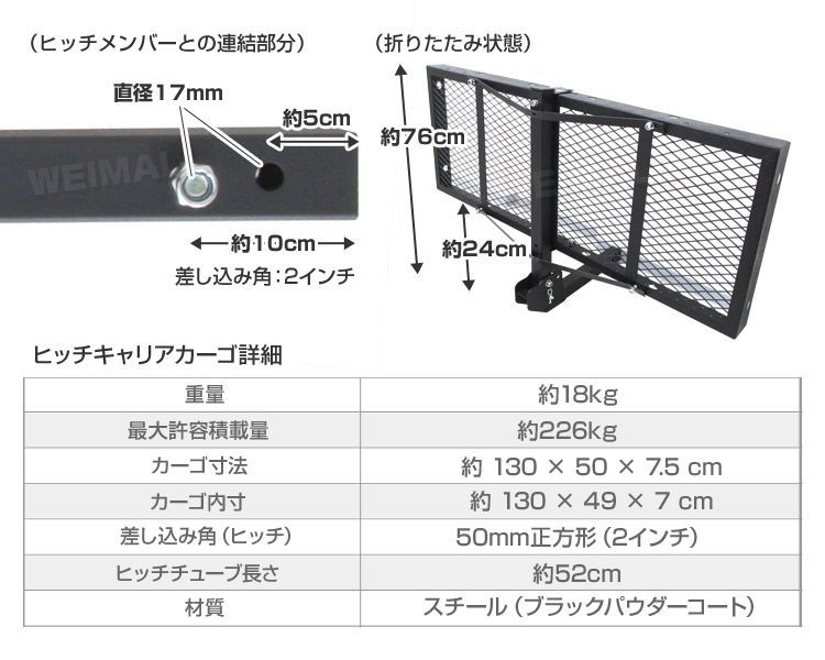 ヒッチキャリアカーゴ 折りたたみ式 車用 Type-B カーゴキャリア ヒッチキャリア ヒッチメンバー 2インチ カーゴ 130 cm 最大積載226 kg